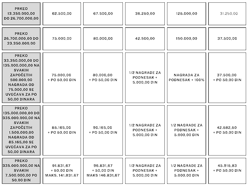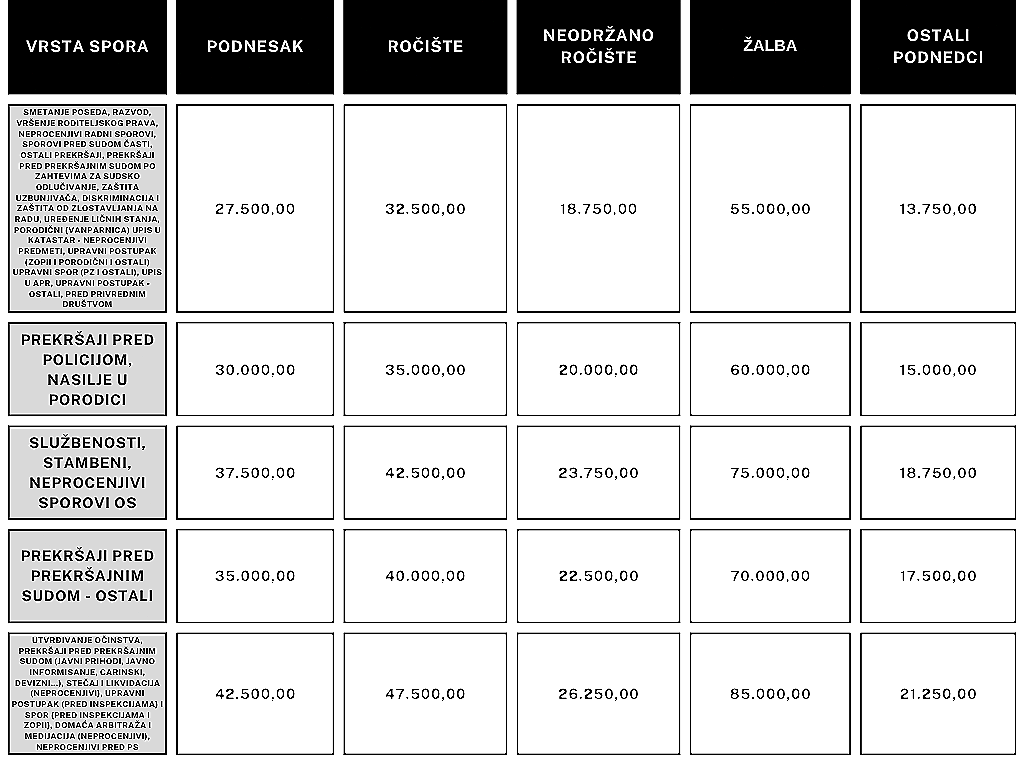 Napomena: Advokat može u pismenom obliku sa strankom ugovoriti nagradu u iznosu koji je manji od iznosa propisanog Tarifom, ali ne manji od 50% tog iznosa ili u iznosu koji je veći od iznosa propisanog Tarifom.